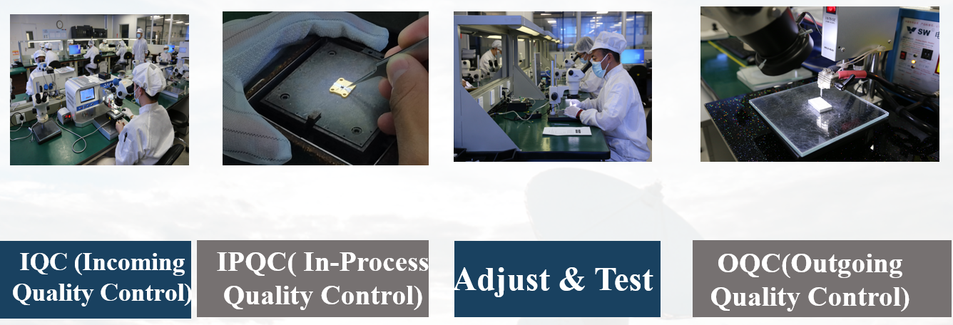 A complete microwave electronic assembly production line has been established and equipped with various instruments and equipment that meet the requirements of research and development, mass production, testing and inspection. Considerable experience has been accumulated in the research and development and production processes of microwave devices. The company possesses high-performance testing instruments and a 100,000-class clean room.