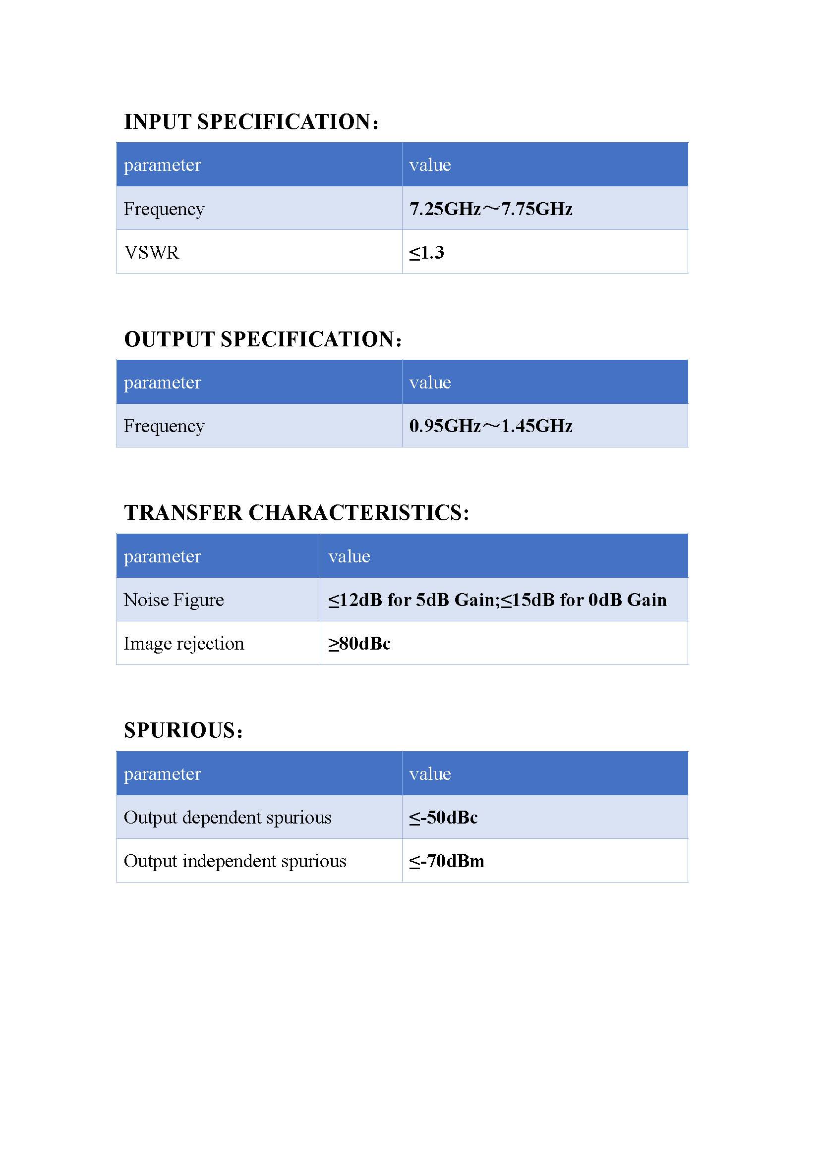 X-Band down-converters mainly change the signal from 7.25GHz~7.75GHz to 0.95GHz~1.45GHz by 1stage conversion,the number of channels is selectable, close requirements can be discussed.